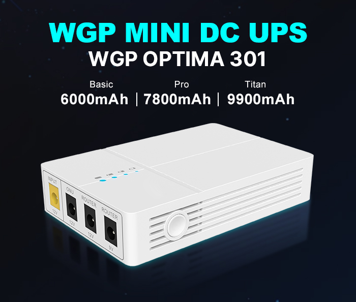 The WGP Optima 301 has three output ports, two 12V 2A DC ports and one 9V 1A output, which is perfect for powering 12V and 9V ONUs or routers. The total output power is 27 watts, and it offers 6000mAh, 7800mAh, and 9900mAh capacities. With the 9900mAh capacity, this model can provide 6 hours of backup time for 6W devices.