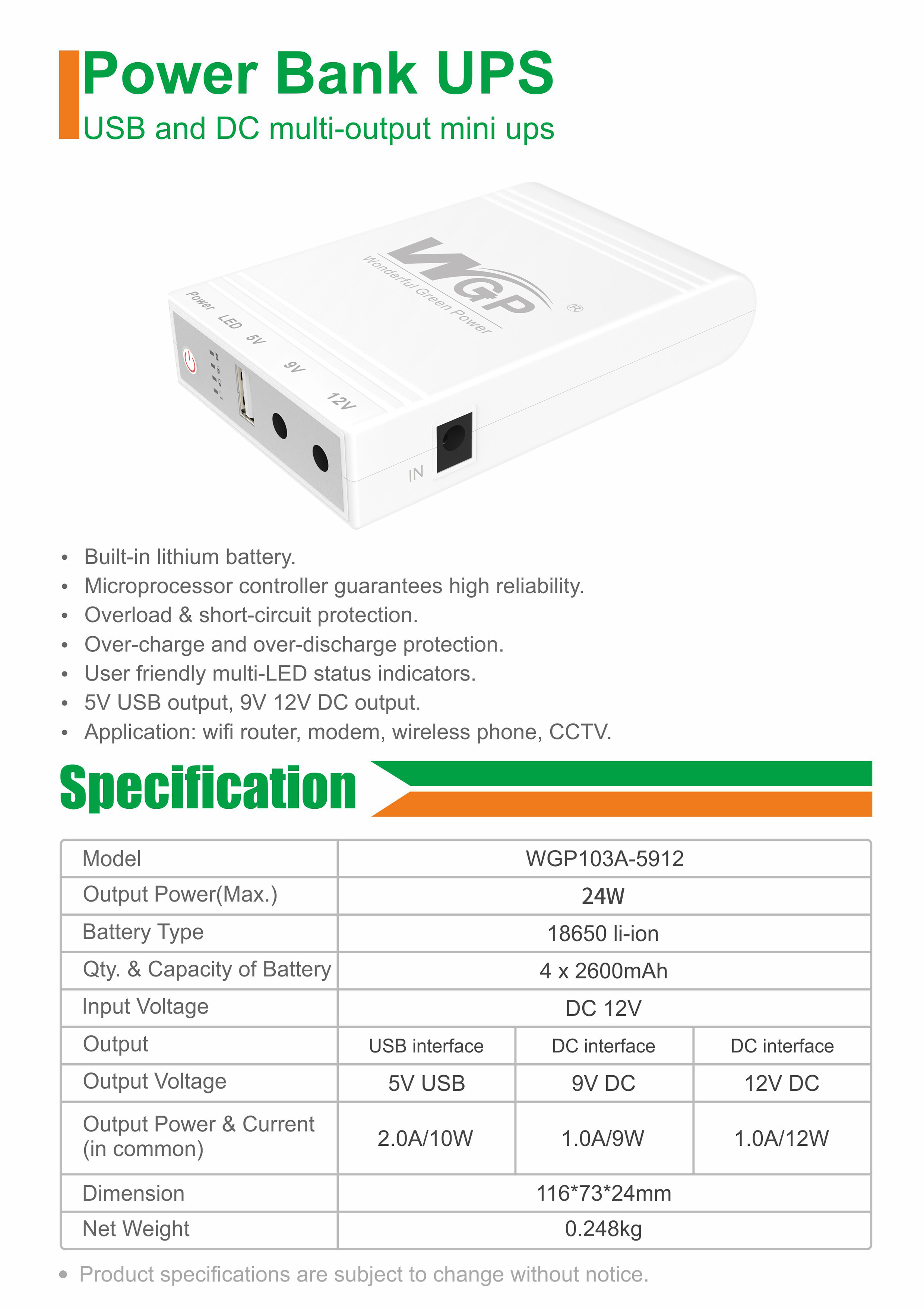 We offer single output and multiple output Mini UPS units, with voltages ranging from 5V, 9V, 12V, to 24V. It is important to verify your device’s voltage needs when choosing the appropriate model before purchasing. For example, if you have a 5V and 12V devices at home. You can choose our multiple outputs-WGP103. With 5V and 12V port, it can power both your devices simultaneously.