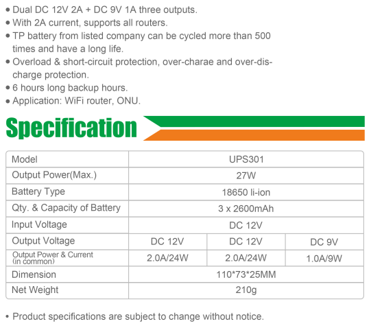 Its standard accessories include two DC cables, and the UPS301 is commonly used in applications involving one 12V ONU and either a 9V or 12V router. It offers a capacity of either 7800mAh or 6000mAh, composed of three 18650 lithium-ion cells (2000mAh or 2600mAh) connected in series.With a capacity of 7800mAh, this model can provide a backup time of 5 hours for 6W devices.